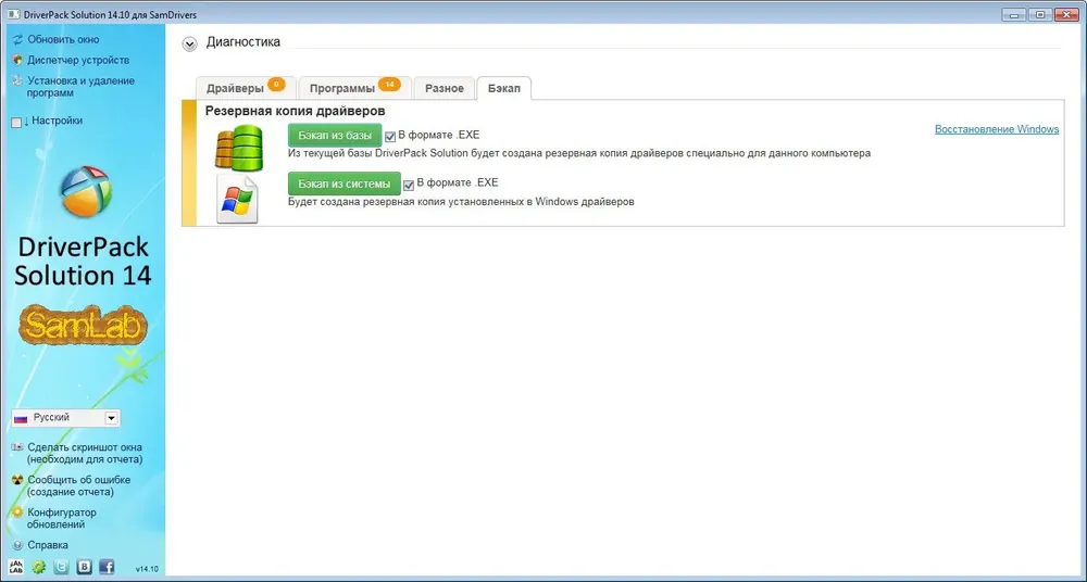 - Присутствует инструмент резервного копирования драйверов Drivers Backup Solution