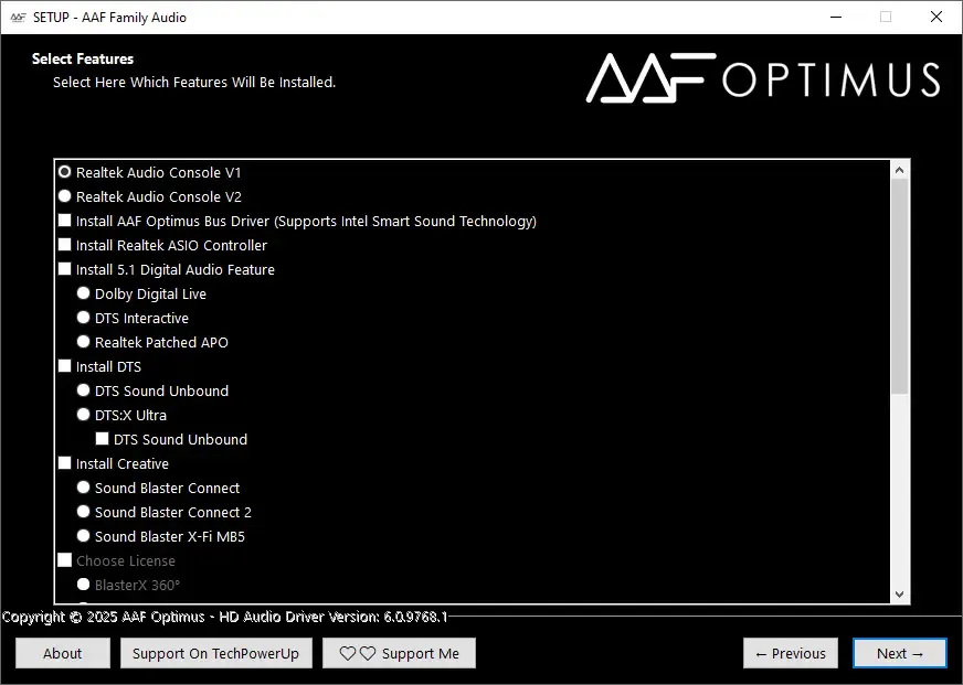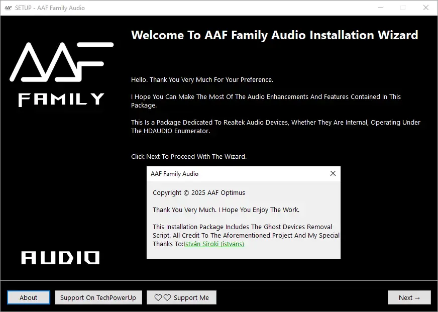 AAF Family представляет собой комплексный аудио драйвер, разработанный на основе Realtek DCH и модифицированный для расширения функциональности. Он предназначен исключительно для использования с аудиочипами Realtek ALC, включая модели HDA и Intel SST. Программное обеспечение интегрирует передовые технологии обработки звука, обеспечивая высокую детализацию, глубину и пространственное восприятие аудиоконтента. Благодаря модульной структуре, пользователь может выбирать нужные компоненты, избегая конфликтов и перегрузки системы.