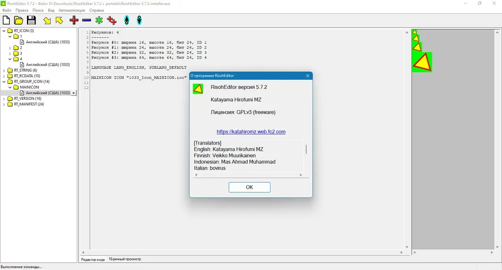 RisohEditor разработан Katayama Hirofumi MZ как мощное и гибкое решение для модификации ресурсов в исполняемых файлах Windows. Название программы происходит от японского слова «Risoh», что означает «идеал», и отражает стремление автора создать совершенный инструмент для редактирования. Программа поддерживает полный спектр типов ресурсов, включая RT_DIALOG, RT_MENU, RT_ICON, RT_CURSOR, а также более специфичные типы, такие как RT_FONT, RT_TOOLBAR и TYPELIB. Благодаря встроенной поддержке Unicode, пользователи могут корректно работать с многоязычными проектами и международными символами.
