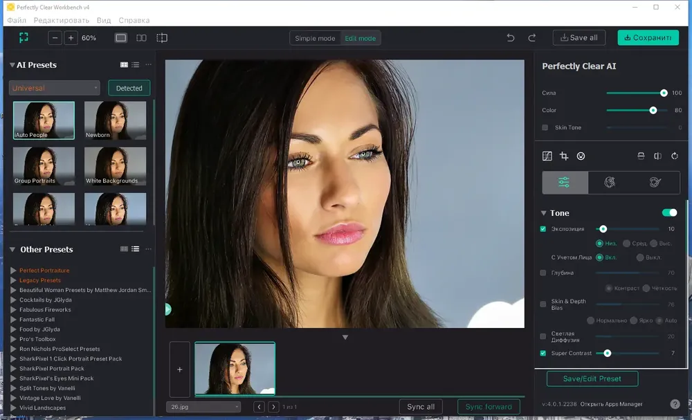 Perfectly Clear WorkBench — это мощный инструмент для автоматической и ручной коррекции цифровых фотографий, разработанный на основе передовых технологий обработки изображений. Программа устраняет типичные дефекты снимков, такие как пересвет, шумы, размытость и цветовые искажения, применяя запатентованные алгоритмы. Это делает её незаменимым помощником как для новичков, так и для профессиональных фотографов, стремящихся к идеальному результату без лишних усилий.