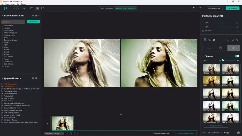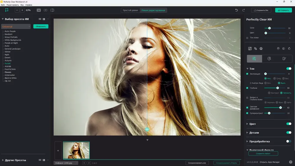 Perfectly Clear – это мощный инструмент для автоматической и ручной коррекции изображений, сочетающий передовые технологии обработки с простотой использования. Программа устраняет дефекты снимков, возникающие из-за ограничений цифровых камер, включая шумы, засветку, размытость и эффект «красных глаз». Благодаря запатентованным алгоритмам и глубокой настройке, она подходит как для новичков, так и для профессионалов в области фотообработки.