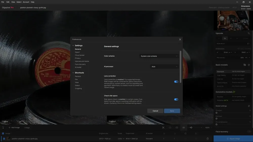 Интерфейс программы интуитивно понятен и не требует глубоких технических знаний. Пользователь загружает изображение, выбирает коэффициент масштабирования — от 100% до 600% — и активирует одну из предустановленных моделей обработки, например, для портретов, архитектуры или сжатых файлов. После запуска обработки нейросеть анализирует изображение, добавляет детали и формирует новое, увеличенное по размеру, но сохраняющее естественность. Поддерживается пакетная обработка, что особенно удобно при работе с большим количеством снимков. Результат можно предварительно просмотреть и сравнить с оригиналом, чтобы оценить качество улучшения.