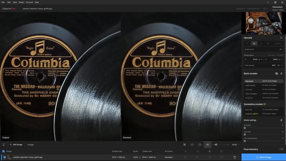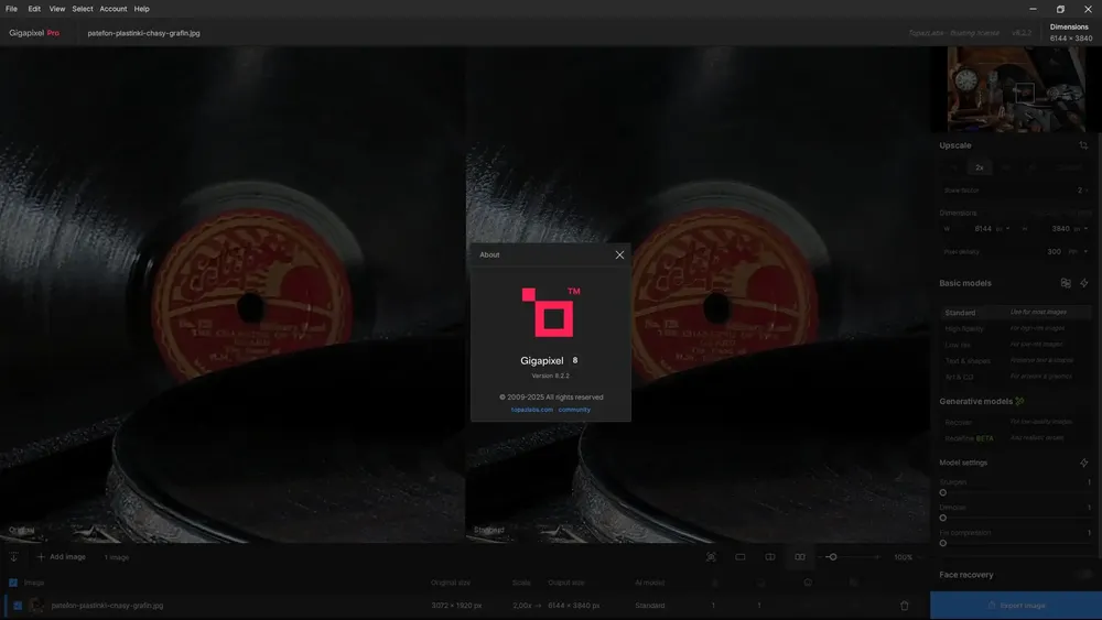 Topaz Gigapixel AI — программное обеспечение на базе искусственного интеллекта, предназначенное для увеличения разрешения изображений с сохранением и воссозданием естественных деталей. Благодаря технологиям глубокого обучения, приложение способно значительно улучшать качество фотографий, устраняя артефакты, добавляя текстуры и повышая чёткость без характерных для традиционных методов размытий и пикселизации. Программа подходит как для профессиональных фотографов, так и для пользователей, стремящихся улучшить визуальное качество своих изображений.