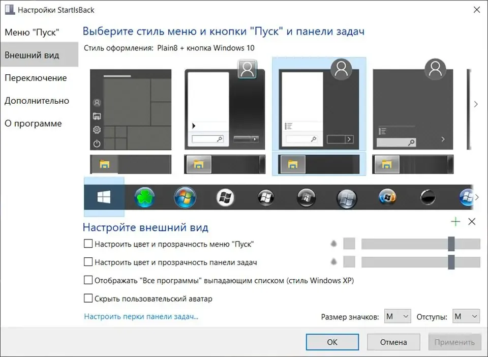 - Гибкие настройки внешнего вида: выбор иконки кнопки, изменение цвета фона, прозрачности и стиля панели задач.