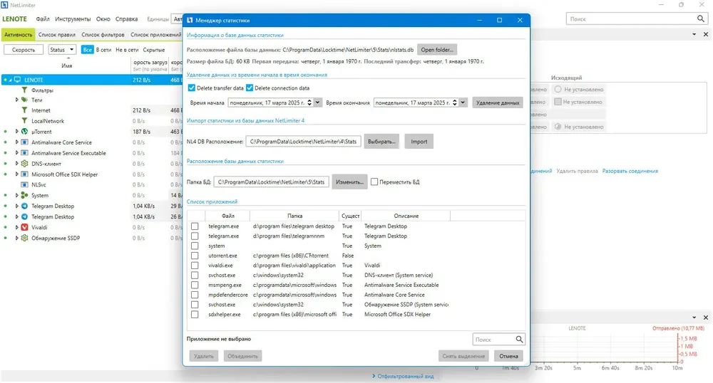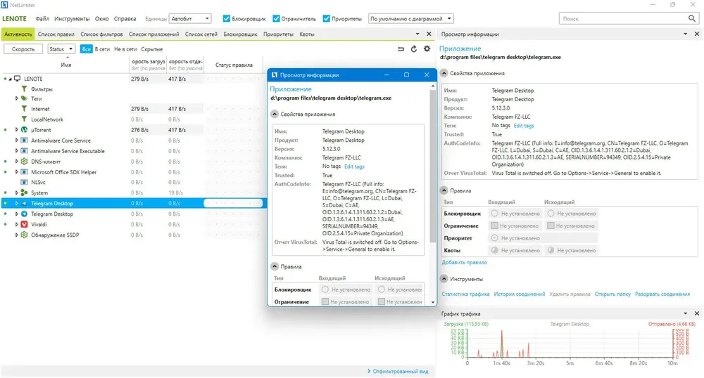NetLimiter представляет собой мощное приложение для мониторинга и управления сетевыми соединениями в операционной системе Windows. Каждое приложение, использующее интернет, отображается отдельно, с указанием текущей скорости передачи данных, общего объёма трафика и активных подключений. Пользователь может создавать правила фильтрации по IP-адресам, портам, протоколам и другим параметрам, обеспечивая точный контроль над сетевым взаимодействием.