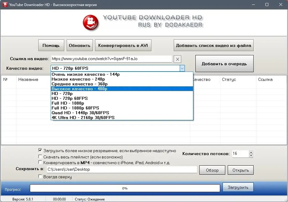 - Поддержка скачивания видео в разрешениях до 4K Ultra HD