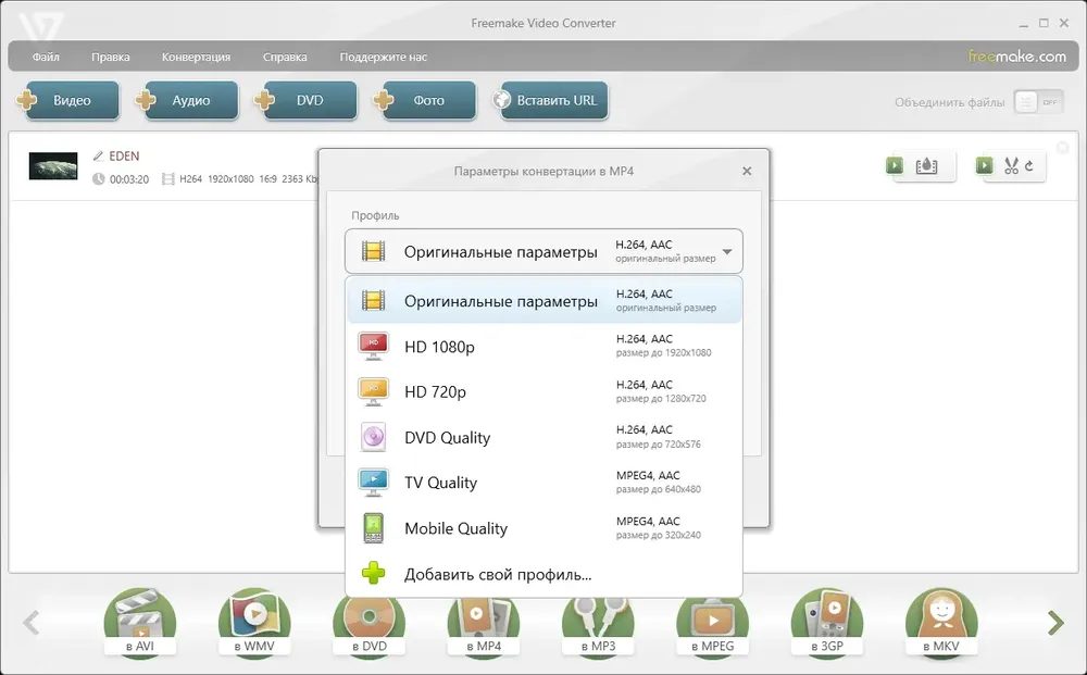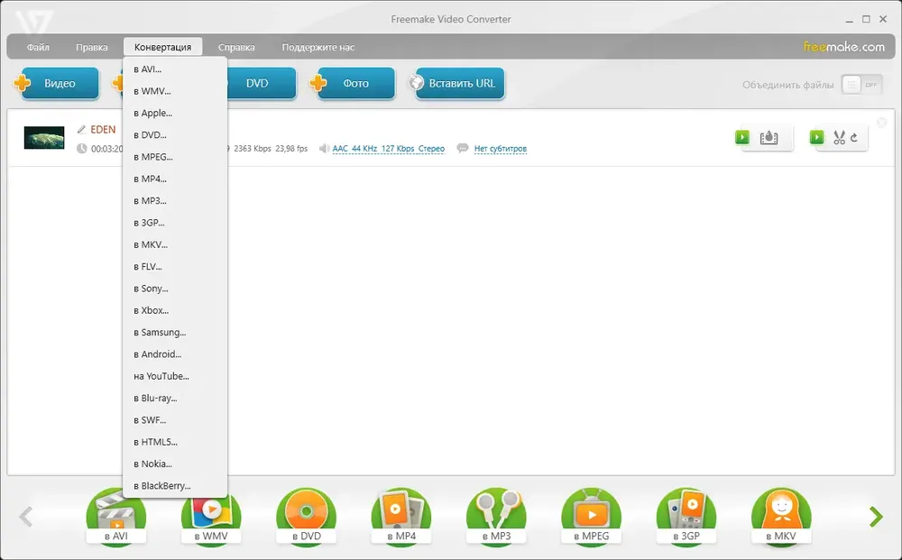 Freemake Video Converter — это мощный инструмент для конвертации видео в более чем 500 форматов, включая MP4, AVI, MKV, а также поддержка аудио и DVD. Программа позволяет редактировать файлы, извлекать звук, создавать слайд-шоу и записывать диски. Подходит как для новичков, так и для пользователей с опытом.