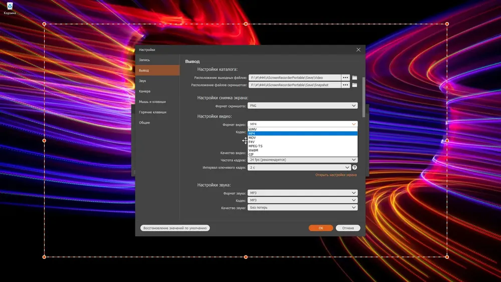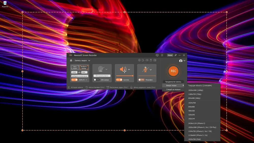 - Запись активности на экране в высоком разрешении с возможностью выбора области