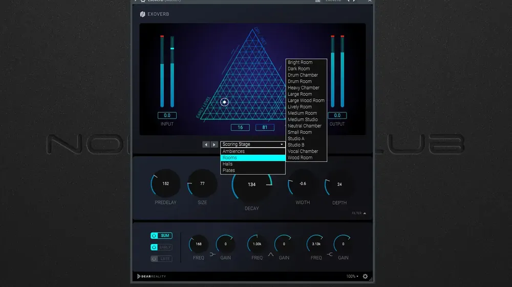 Работа с EXOVERB начинается с загрузки плагина в цифровой аудиоредактор, совместимый с форматами VST3, AU или AAX. После этого пользователь может выбрать одну из 50 доступных акустических сцен, ориентируясь на характер трека — от небольшой комнаты до большого концертного зала. Основной инструмент управления — треугольный пэд — позволяет в реальном времени балансировать между сухим сигналом, ранними отражениями и общим реверберационным хвостом.