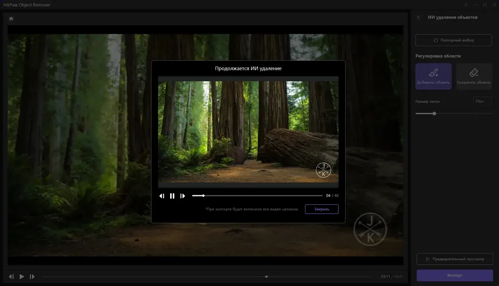 Для начала работы загрузите видеофайл в интерфейс программы и выберите область, которую необходимо удалить. С помощью кисти выделите объект или активируйте автоматическое распознавание, чтобы AI сам определил границы. После подтверждения программа просканирует все кадры, отследит перемещение объекта и применит коррекцию фона. Процесс занимает несколько минут в зависимости от длительности ролика и мощности устройства. Готовый результат можно экспортировать в популярных форматах, включая MP4 и MOV, с сохранением исходного разрешения.