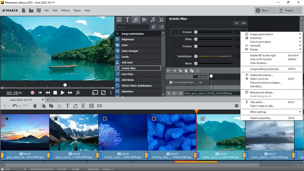 MAGIX Photostory — это программное решение для создания динамичных фотоисторий из цифровых снимков и видеороликов. Программа позволяет не просто демонстрировать изображения под музыку, но и добавлять панорамные эффекты, зумы, плавные переходы и анимированные титры. Благодаря встроенным инструментам обработки, пользователь может улучшить качество изображений, отредактировать цветокоррекцию и наложить фильтры перед созданием финального ролика.