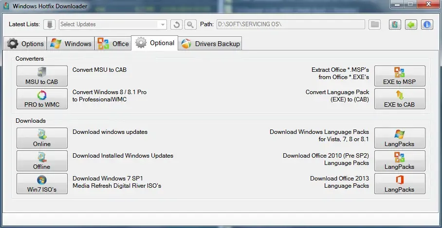 Hotfix Downloader — это компактная бесплатная утилита, предназначенная для загрузки и интеграции обновлений операционной системы Windows и офисного пакета Microsoft Office. Программа поддерживает Windows 7, 8 и 8.1, а также Office 2010 и 2013, позволяя получать актуальные патчи, сервисные паки, языковые обновления и компоненты сред выполнения. Все загруженные элементы можно использовать как для ручного применения, так и для создания полностью обновлённых установочных образов.