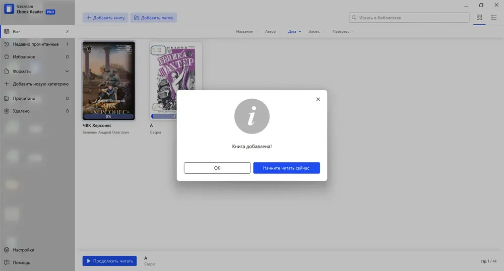 IceCream Ebook Reader — удобная программа для чтения электронных книг на компьютере, поддерживающая множество форматов, включая ePub, MOBI, FB2 и CBR. Программа обеспечивает комфортное чтение с поддержкой ночной темы, закладок, заметок и переворота страниц как в реальной книге. Управлять библиотекой становится проще благодаря интуитивному интерфейсу и встроенным инструментам навигации.