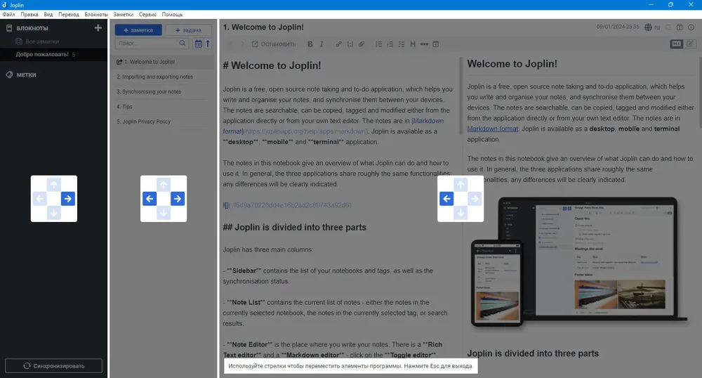 Использование Joplin начинается с создания учётной записи или настройки локального хранилища. После запуска приложения можно создавать блокноты, добавлять в них заметки, использовать теги для категоризации и быстро находить нужную информацию через встроенный поиск. Редактирование происходит в режиме реального времени, с предварительным просмотром Markdown и возможностью вставки изображений, файлов и гиперссылок.