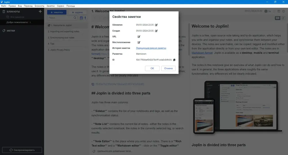 Joplin представляет собой современное приложение для управления информацией, ориентированное на пользователей, ценящих прозрачность, безопасность и гибкость. Все данные хранятся в открытых форматах, что позволяет легко просматривать, редактировать и переносить их даже без самого приложения. Заметки поддерживают разметку Markdown, что упрощает форматирование текста, добавление списков, заголовков и вложений.