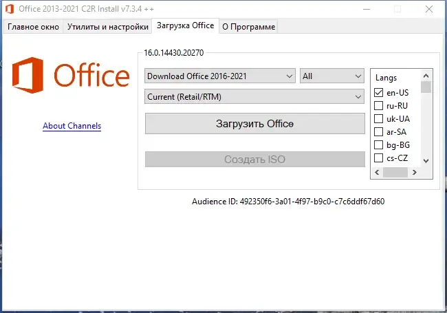 - Позволяет скачать microsoft office с выбором версии, языка и разрядности