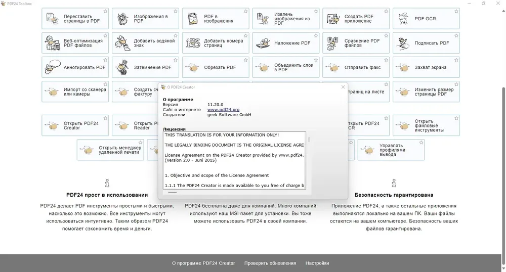 PDF24 Creator сочетает в себе простоту установки и богатый функционал, что делает её одним из лучших решений для работы с PDF без необходимости использования платных аналогов.