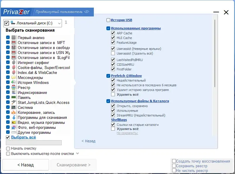 PrivaZer — это мощная утилита для очистки системы от следов пользовательской активности, обеспечивающая высокий уровень конфиденциальности. Программа сканирует реестр, временные файлы, историю браузеров, куки, файлы подкачки и гибернации, а также данные с USB-устройств. Благодаря продуманной архитектуре и интеллектуальным алгоритмам очистки, она не только удаляет остаточные данные, но и предотвращает их восстановление.