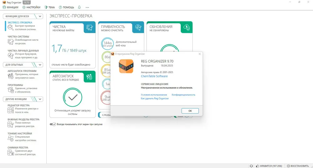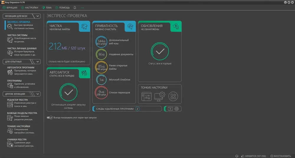 Reg Organizer демонстрирует высокую эффективность при оптимизации системы. Его функционал охватывает широкий спектр задач, связанных с обслуживанием реестра и управления установленным ПО. Программа работает стабильно, не нагружает систему и поддерживает все актуальные версии Windows. Интерфейс переведён на русский язык, что упрощает навигацию. При этом она остаётся компактной и не требует сторонних библиотек для работы.