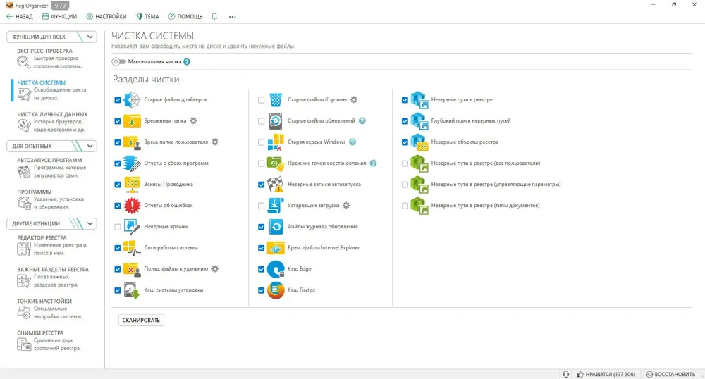 - Проводит глубокую очистку реестра от мусора и ошибок