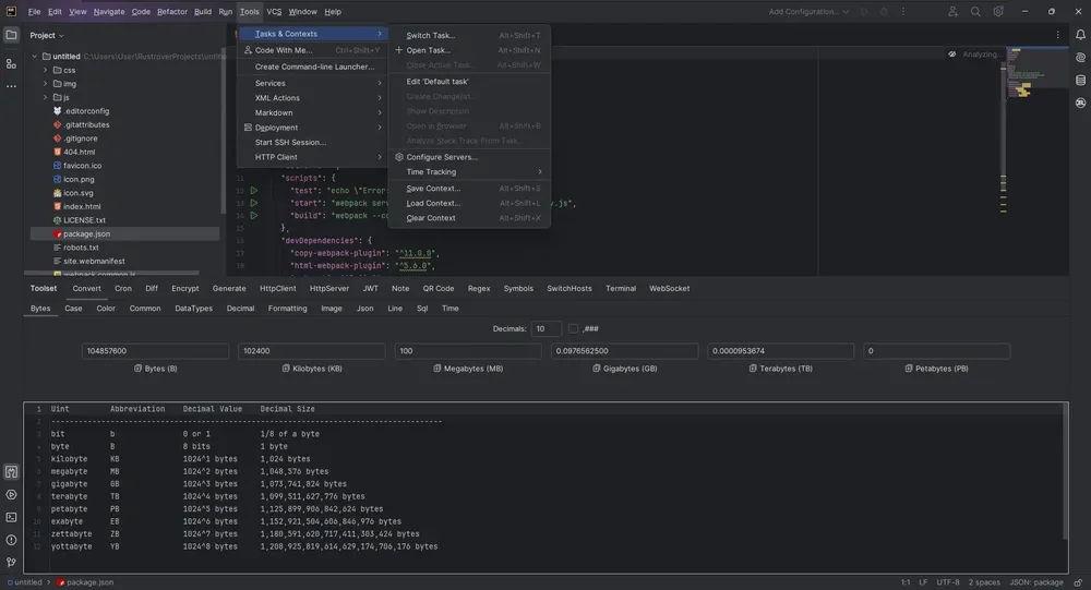 - Наличие встроенного терминала, тест-раннера и профилировщика производительности.