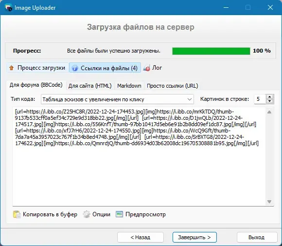 Программа позволяет не только загружать, но и перезаливать изображения из HTML- или BBCode-разметки, сохраняя структуру контента.