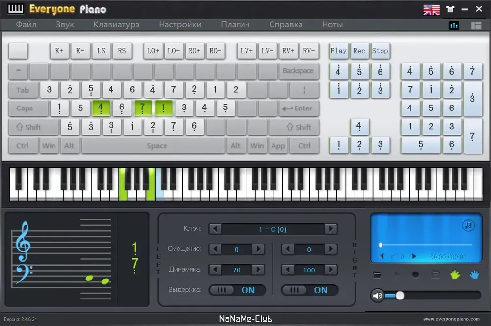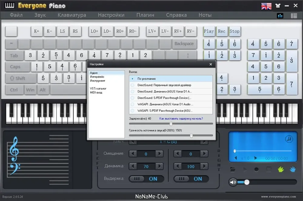 - Гибкая настройка макета клавиш и отображения нот на экране.