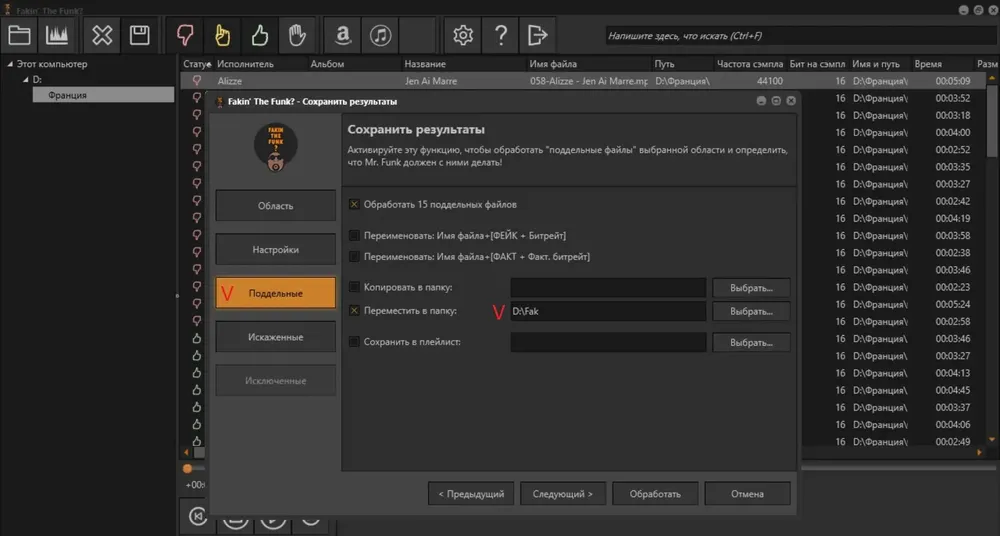 Использование Fakin The Funk не требует глубоких технических знаний. Достаточно перетащить аудиофайлы или папки с музыкой в рабочую область программы для начала анализа. Система автоматически запускает многопоточную обработку, что позволяет быстро сканировать большие библиотеки. Результаты отображаются в виде наглядных графиков и текстовой информации: указывается реальный битрейт, наличие обрезания по частоте, повреждения данных и другие параметры.