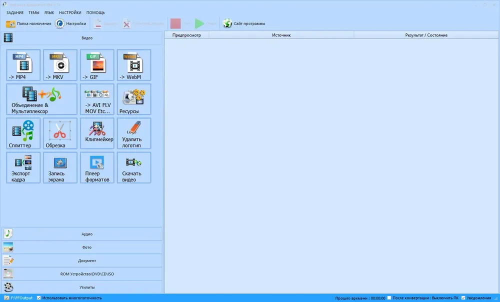 Интерфейс программы интуитивно понятен и разделён по категориям: видео, аудио, изображения, документы и диски. Для конвертации достаточно выбрать нужный формат, добавить файлы и настроить параметры вывода. Поддерживается пакетная обработка, что позволяет обрабатывать сразу несколько файлов без повторных настроек. После завершения операции программа уведомляет пользователя и может автоматически открыть папку с результатами.