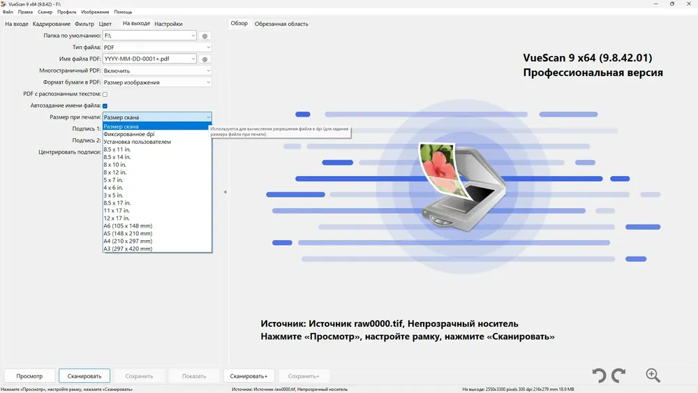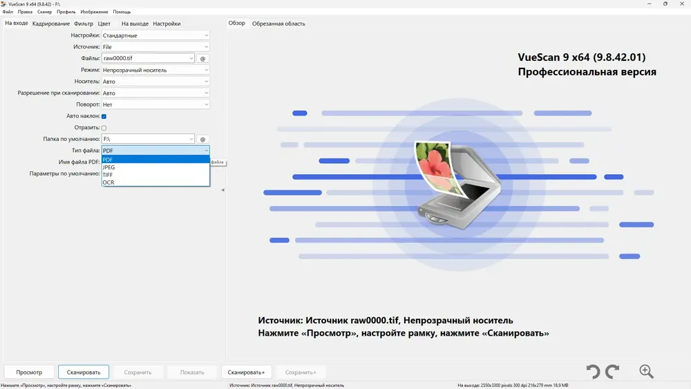 - Возможность создания RAW-файлов для последующей обработки без повторного сканирования