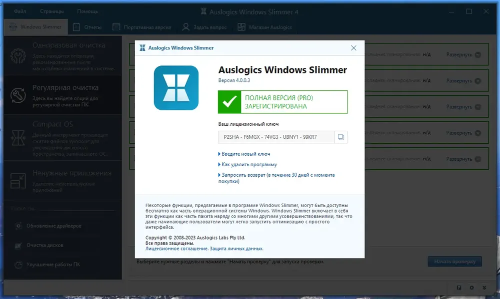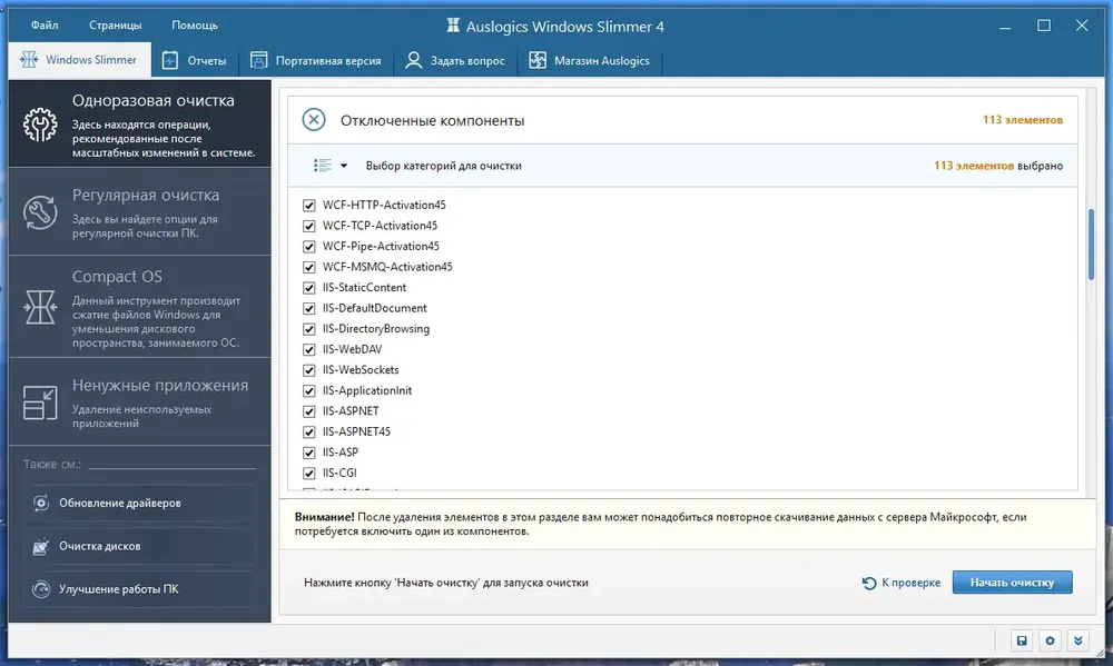 Auslogics Windows Slimmer — это инструмент для тонкой настройки и сокращения размера операционной системы Windows. Программа позволяет удалить ненужные компоненты, освободить место на диске, снизить нагрузку на процессор и оперативную память. Она также повышает приватность за счёт отключения фоновых служб, передающих данные без ведома пользователя.