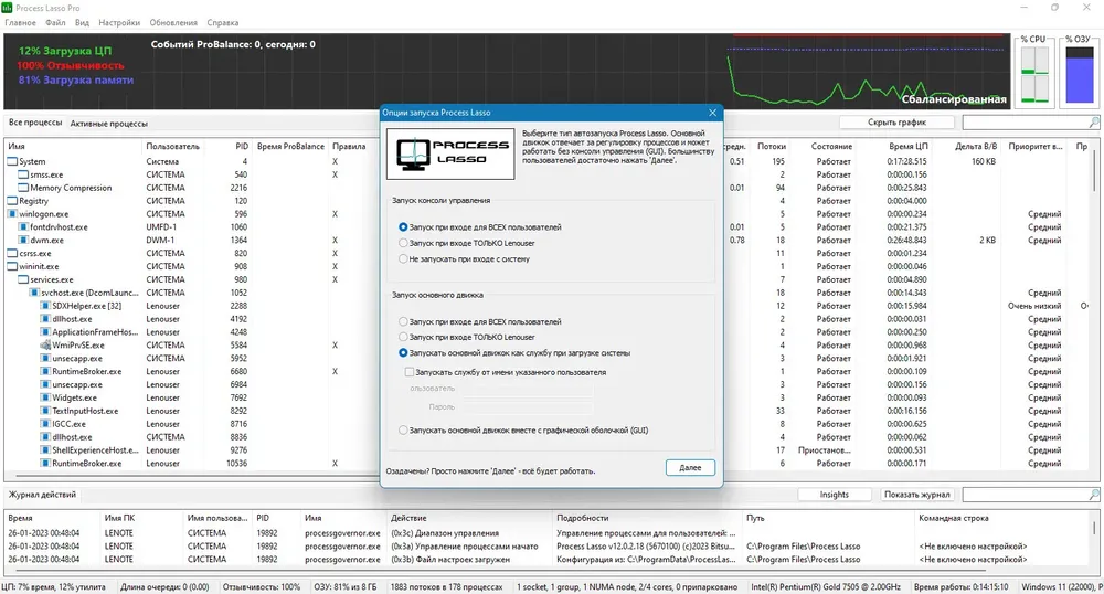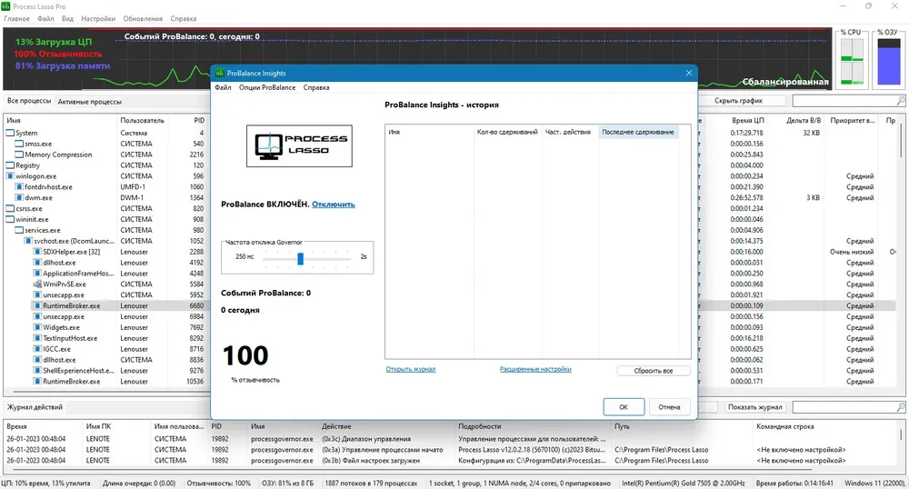 Bitsum Process Lasso — системная утилита для тонкой настройки приоритетов процессов в реальном времени, направленная на повышение отзывчивости операционной системы. Программа автоматически контролирует активность программ, снижая нагрузку от «прожорливых» процессов, что предотвращает подтормаживания и зависания. Использование технологии ProBalance обеспечивает стабильную работу даже при высокой загрузке центрального процессора.