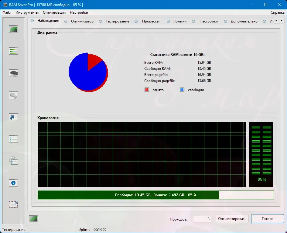 RAM Saver — это утилита для мониторинга и оптимизации оперативной памяти, предназначенная для повышения стабильности и скорости работы системы. Программа эффективно управляет ресурсами RAM, устраняя утечки памяти и дефрагментируя её для ускоренного доступа. Подходит как для опытных пользователей, так и для тех, кто ищет простой способ улучшить производительность компьютера без аппаратного апгрейда.