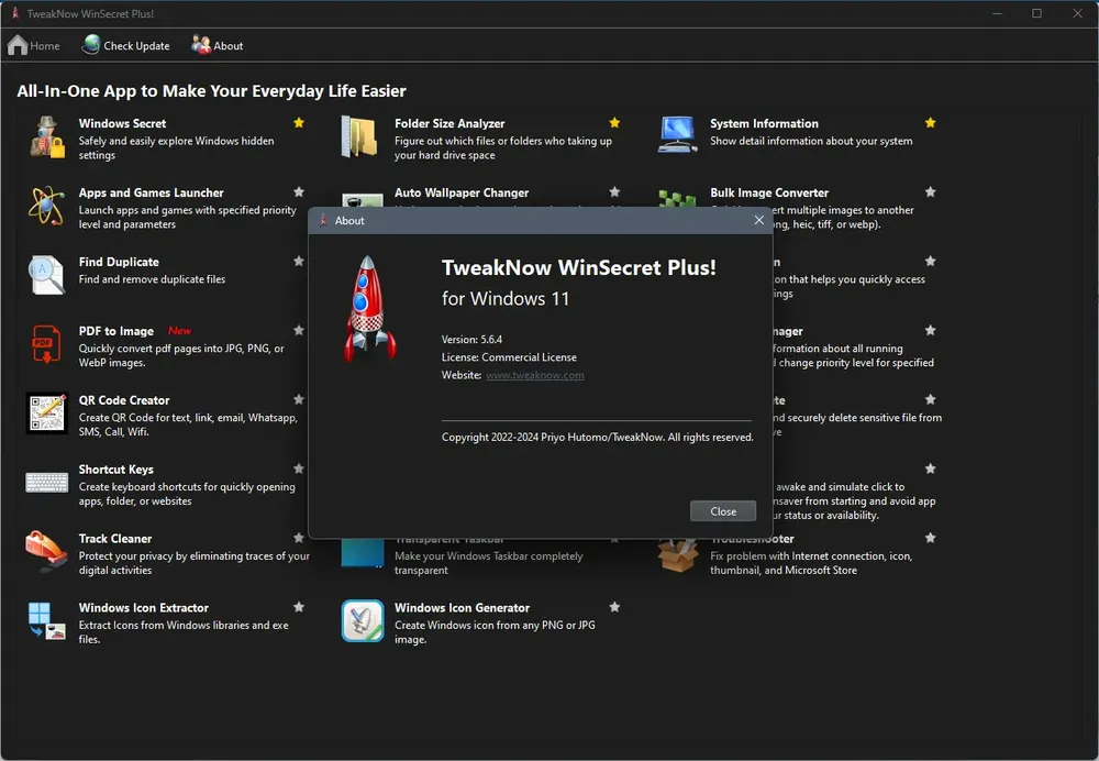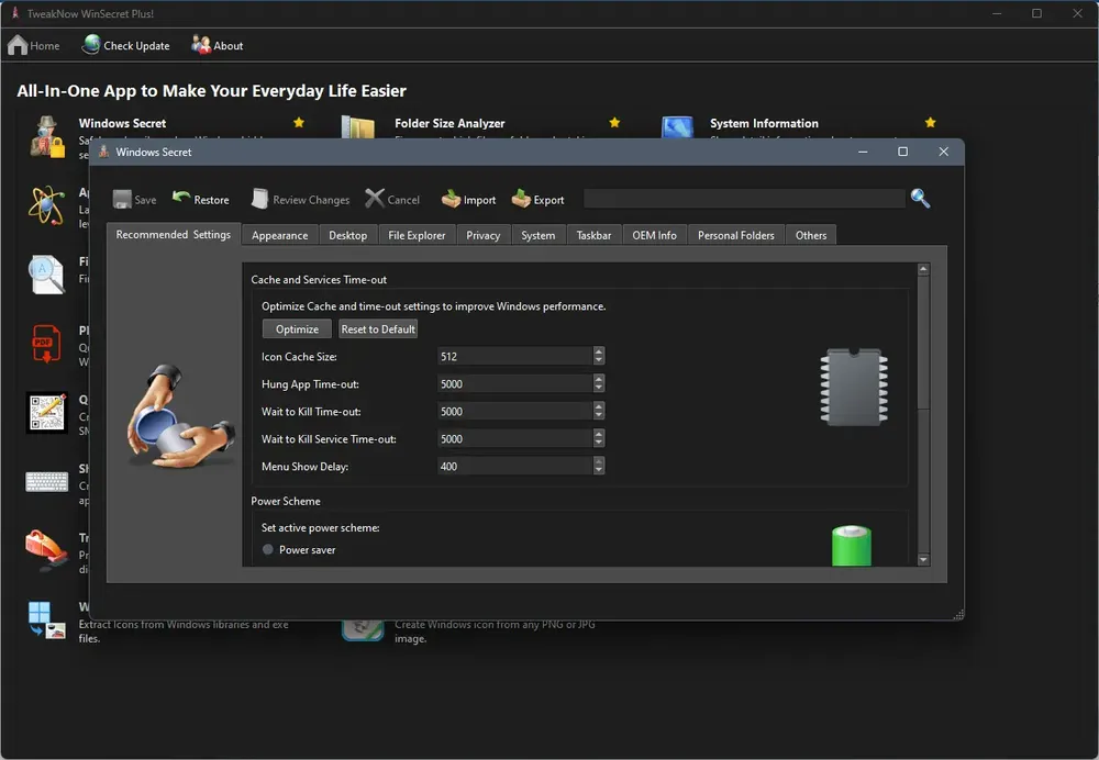 TweakNow WinSecret Plus — это мощный инструмент для тонкой настройки операционной системы Windows 10 и Windows 11, открывающий доступ к скрытым параметрам реестра через интуитивно понятный интерфейс. Программа позволяет изменять внешний вид системы, оптимизировать поведение интерфейса и управлять приватностью без необходимости ручного редактирования реестра. Подходит как для обычных пользователей, так и для продвинутых, стремящихся персонализировать свою систему.