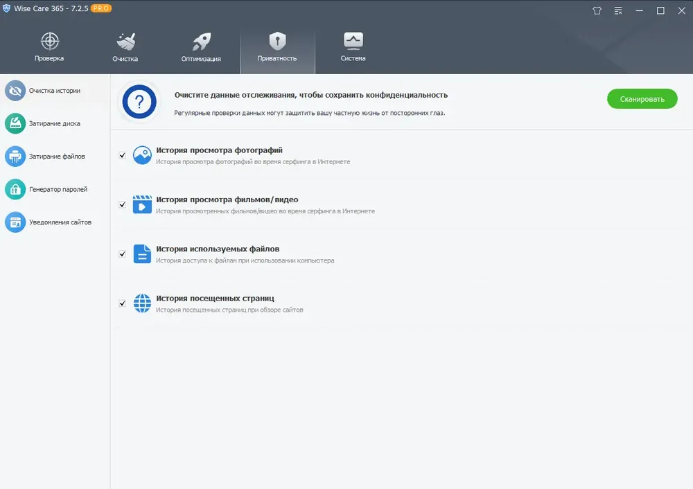 - Удаление временных файлов, кэша браузеров и других следов активности пользователя.