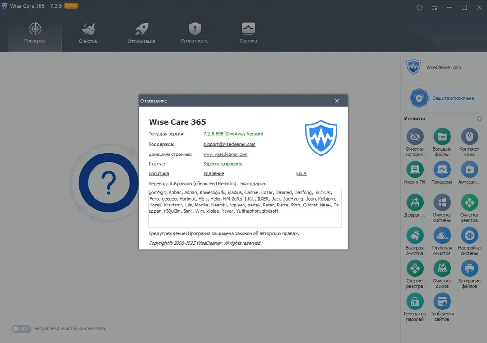 Wise Care 365 — комплексная утилита для оптимизации и обслуживания операционной системы Windows. Программа объединяет функции очистки реестра, дефрагментации дисков, управления автозагрузкой и защиты конфиденциальных данных. Подходит как начинающим пользователям, так и продвинутым, обеспечивая стабильность, высокую скорость работы и безопасность системы.