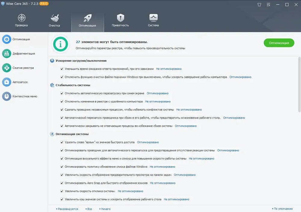 - Очистка и дефрагментация системного реестра для устранения ошибок и повышения стабильности.