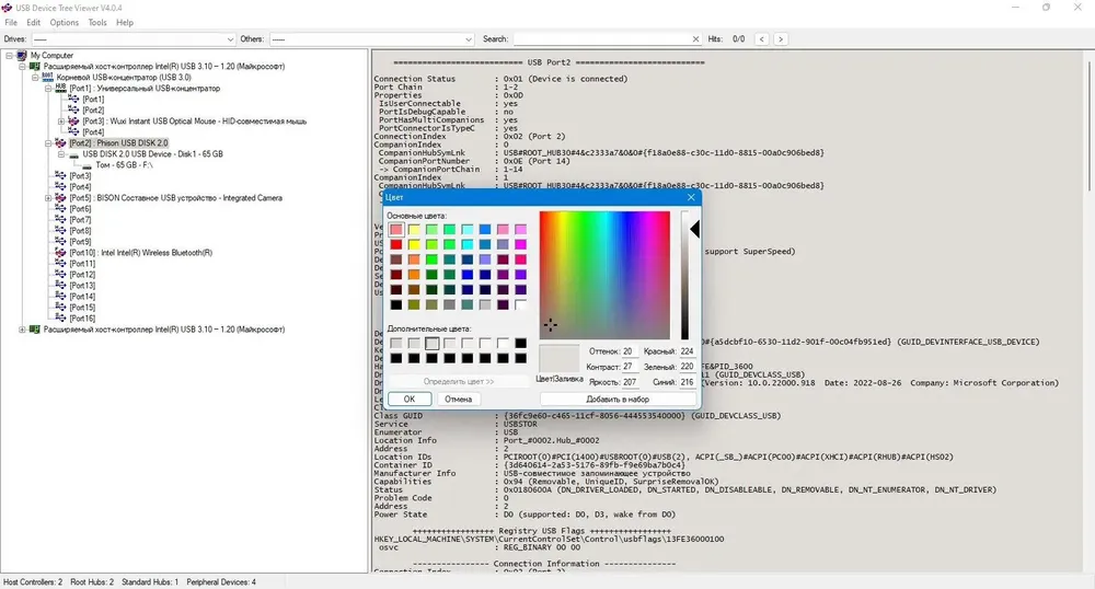 USB Device Tree Viewer основана на исходном коде Microsoft USBView, но значительно превосходит оригинальный инструмент по функциональности и удобству использования. Утилита отображает полную топологию подключений USB в виде дерева, где каждый узел представляет собой хост-контроллер, концентратор или подключённое устройство. Информация собирается в реальном времени и обновляется асинхронно, не сбрасывая при этом текущий выбор. Это позволяет отслеживать изменения в системе без потери контекста, что особенно полезно при диагностике сложных конфигураций.