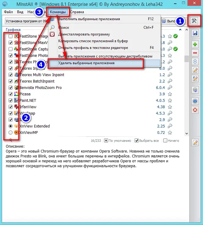 Запуск сборки начинается с отключения антивируса или добавления папки с дистрибутивом в исключения. После запуска MInstAll откроется окно с категориями программ. Выбирая нужные компоненты, пользователь может предварительно прочитать описание в нижней части интерфейса. Установка запускается нажатием кнопки «Установить», после чего процесс проходит в автоматическом режиме. Для массового удаления ненужных программ предусмотрена функция «Выбрать приложения с отсутствующим дистрибутивом» в меню «Команды». Подсветка установленных программ зелёным цветом помогает отслеживать прогресс.